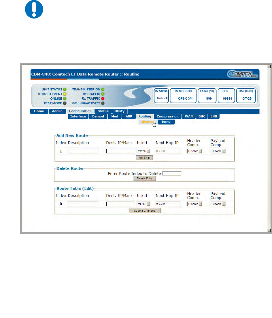 By using the ‘Configuration | Routing (Routes)’ page (Figure 5-13) static routes can be entered