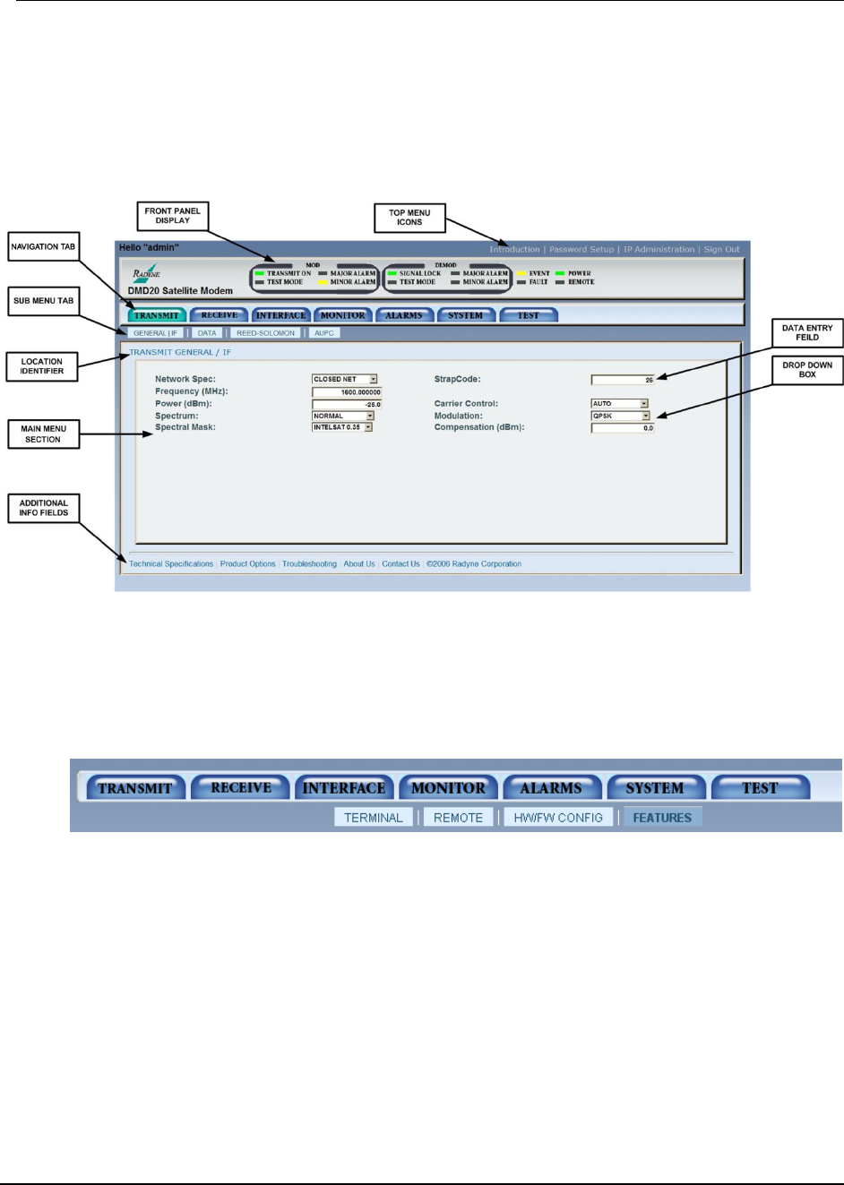 navigation tab to see the related sub-menu. The sub-menus correspond to the front panel sub-